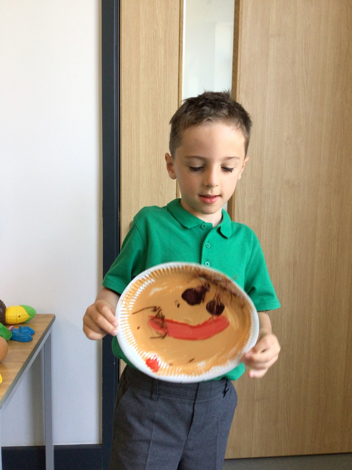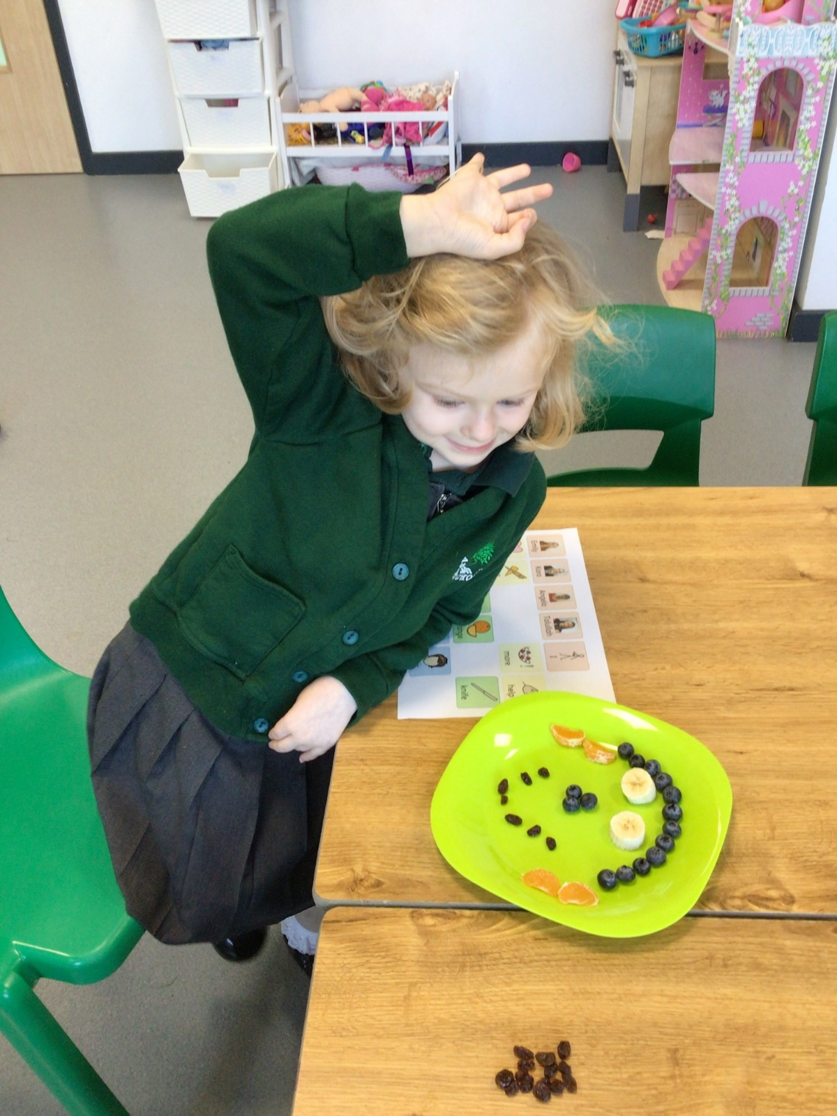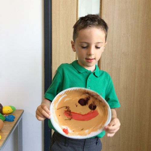 We have been looking at what we look like and have made some amazing self-portraits using clay, paper plates, fruit and pizza. The story is full of different patterns, especially spots and stripes! We have used this to support our early writing skills by mark making using a range of tools. Dickinson Class have also explored pattern making and developing their counting skills in Maths by exploring numicon and counting bears.