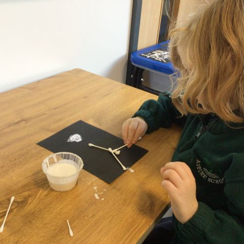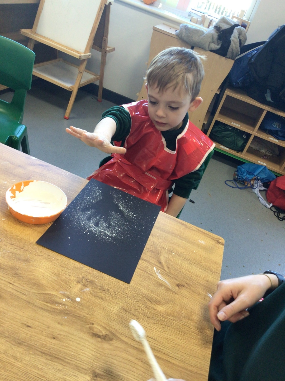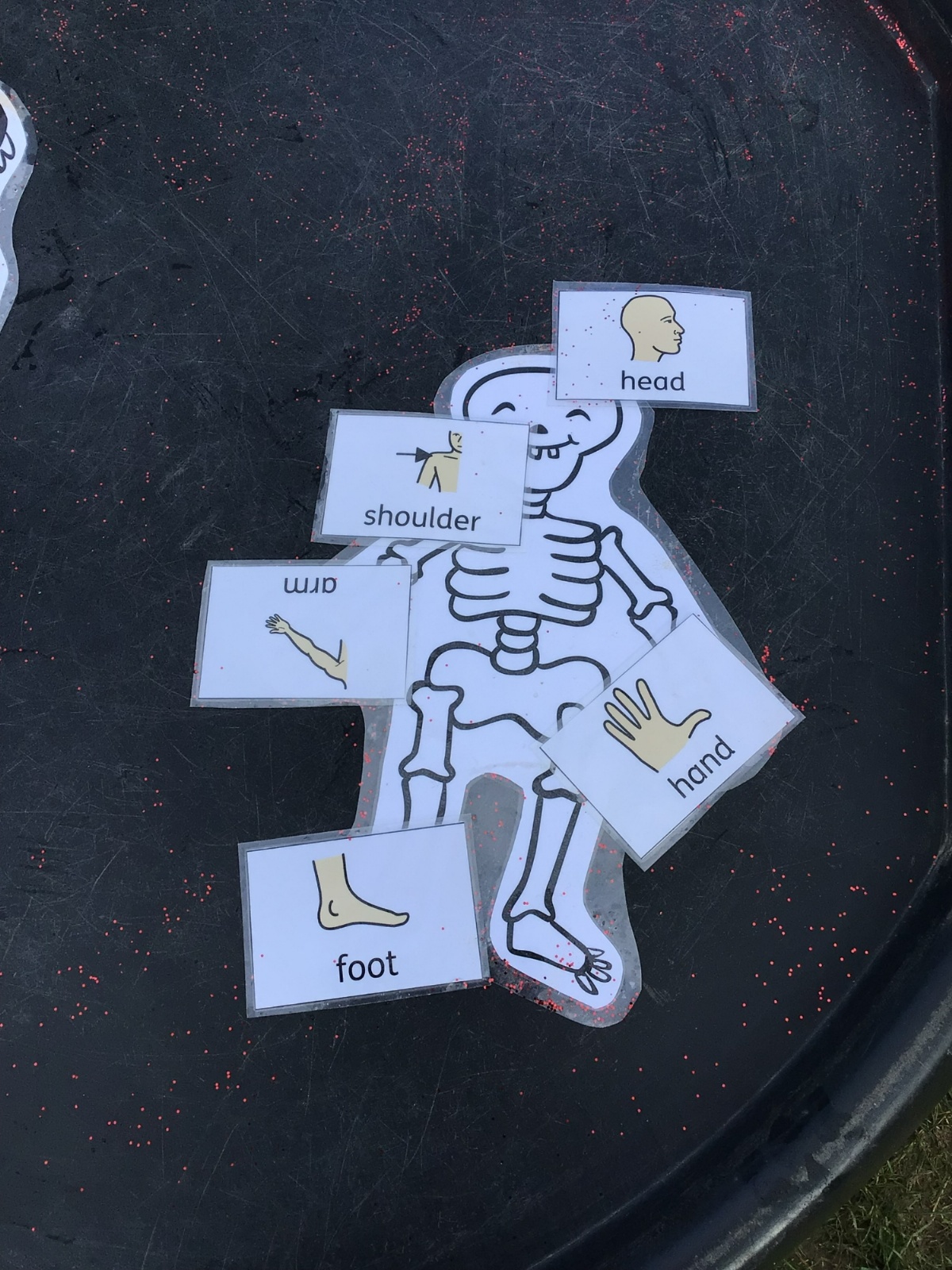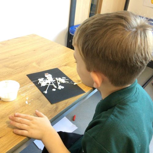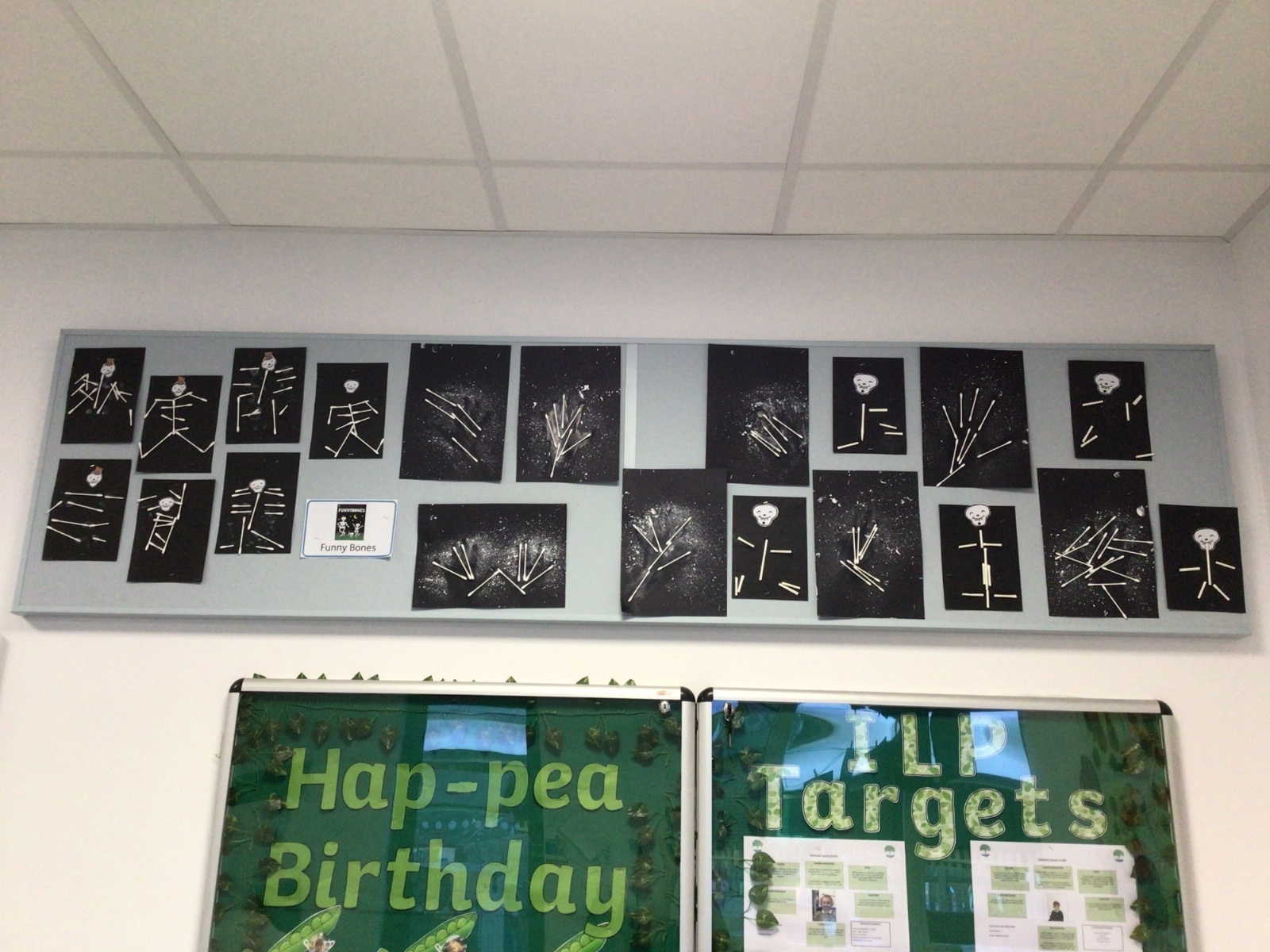 We have had so much fun learning all about the story Funny Bones and have explored  all our curriculum through this book.   We learnt about the parts of our body, including where our bones are, and created our own artwork to demonstrate this. In Art, we also began exploring junk modelling by making    houses from the story and creating a little town on top of a cupboard.  In Cooking we made skull quesadillas by cutting out features of a wrap and choosing cheese, tomato or both to go inside before cooking them in the oven.  We continued to work on our number skills and made a number line on the washing line outside using characters from the story.